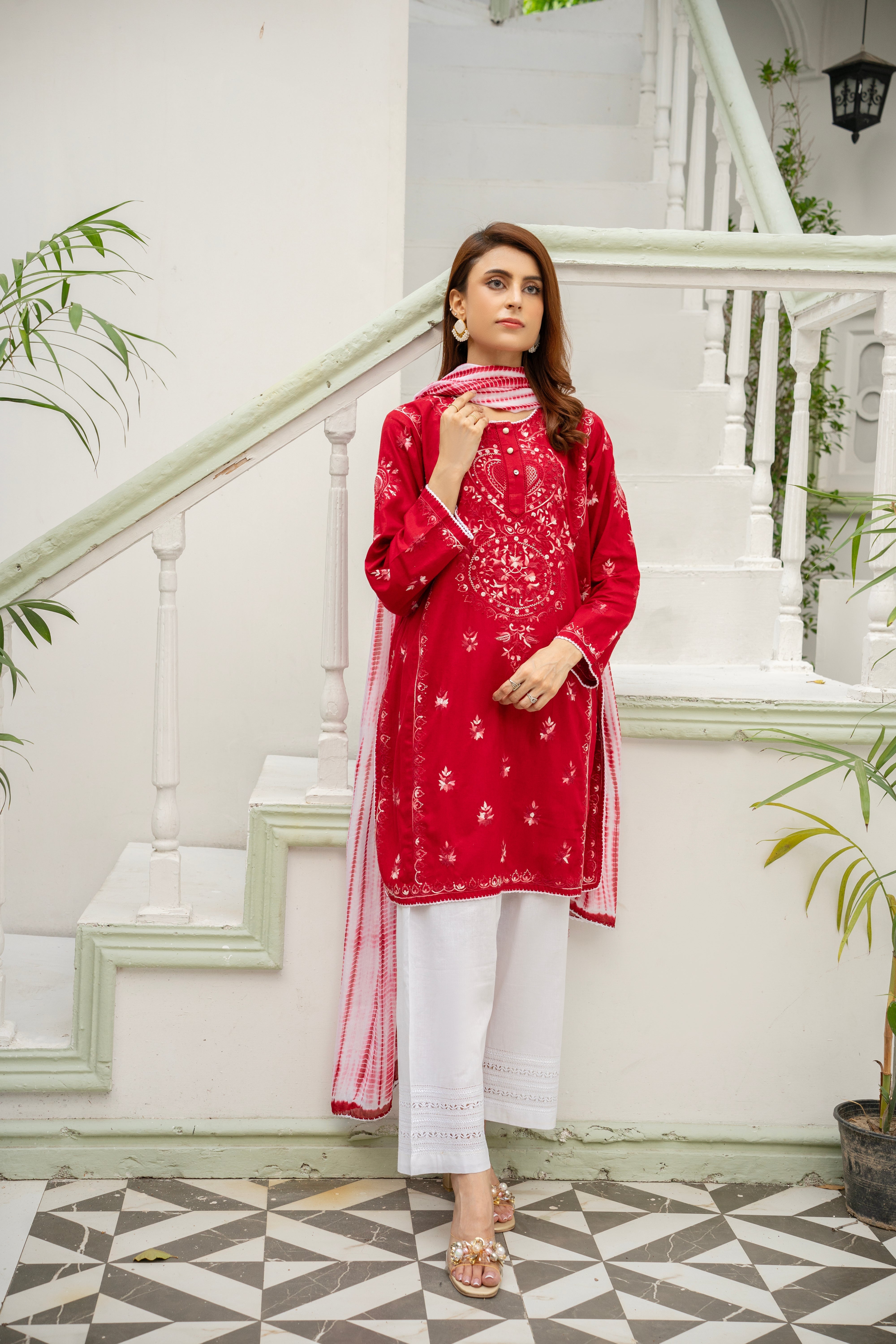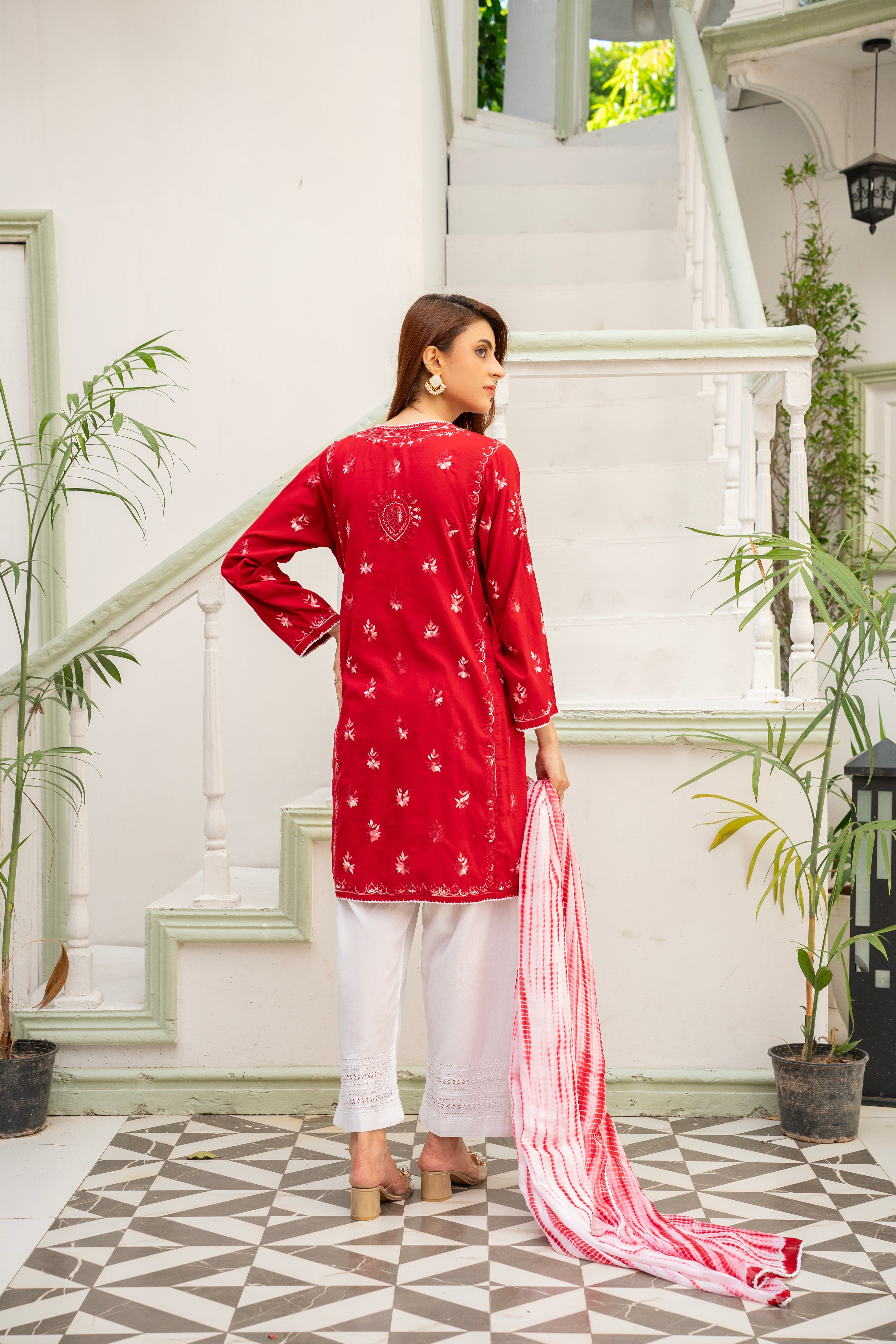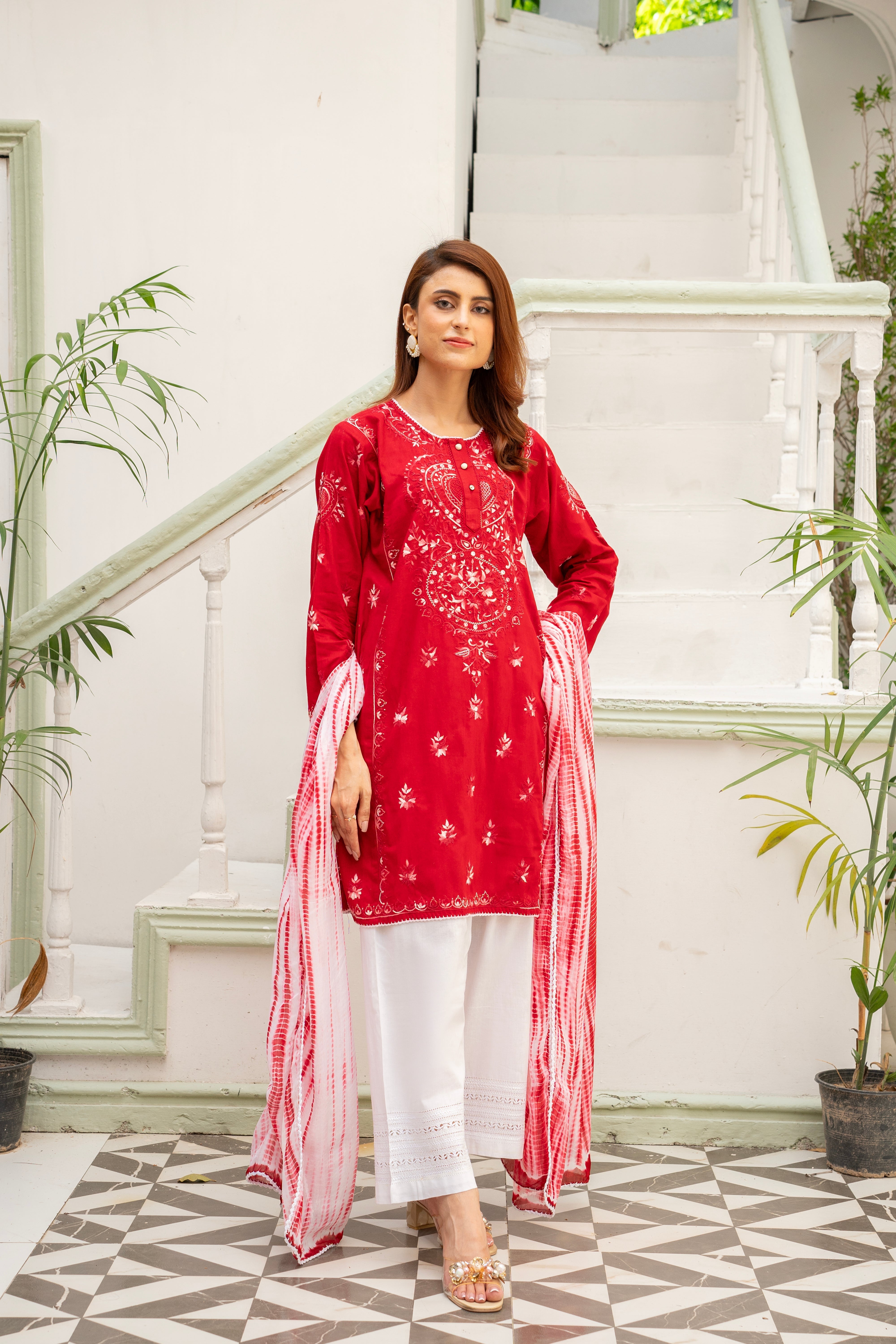 Maroon Embroidered Kurti With Dupatta – ( Stitched )