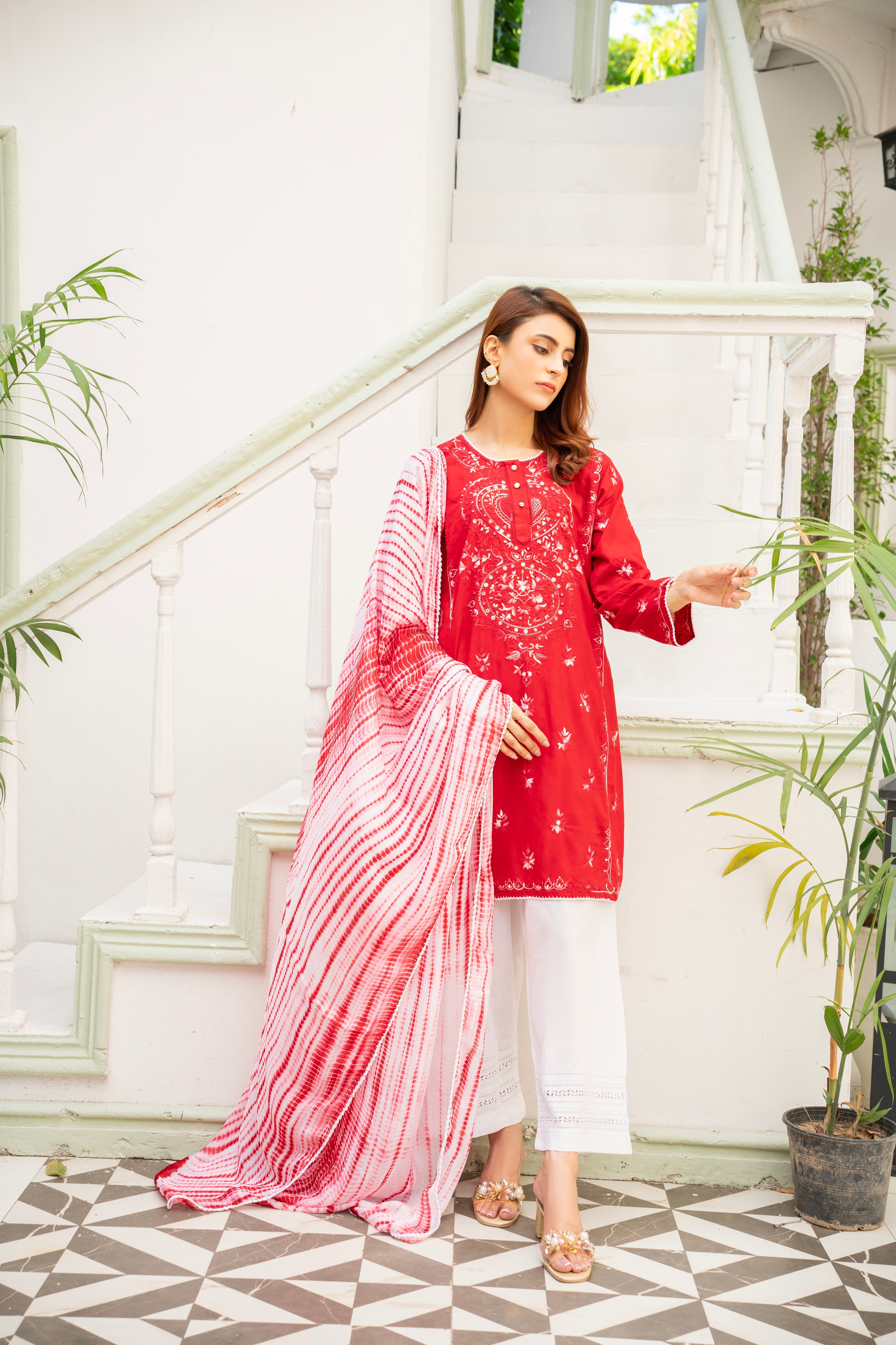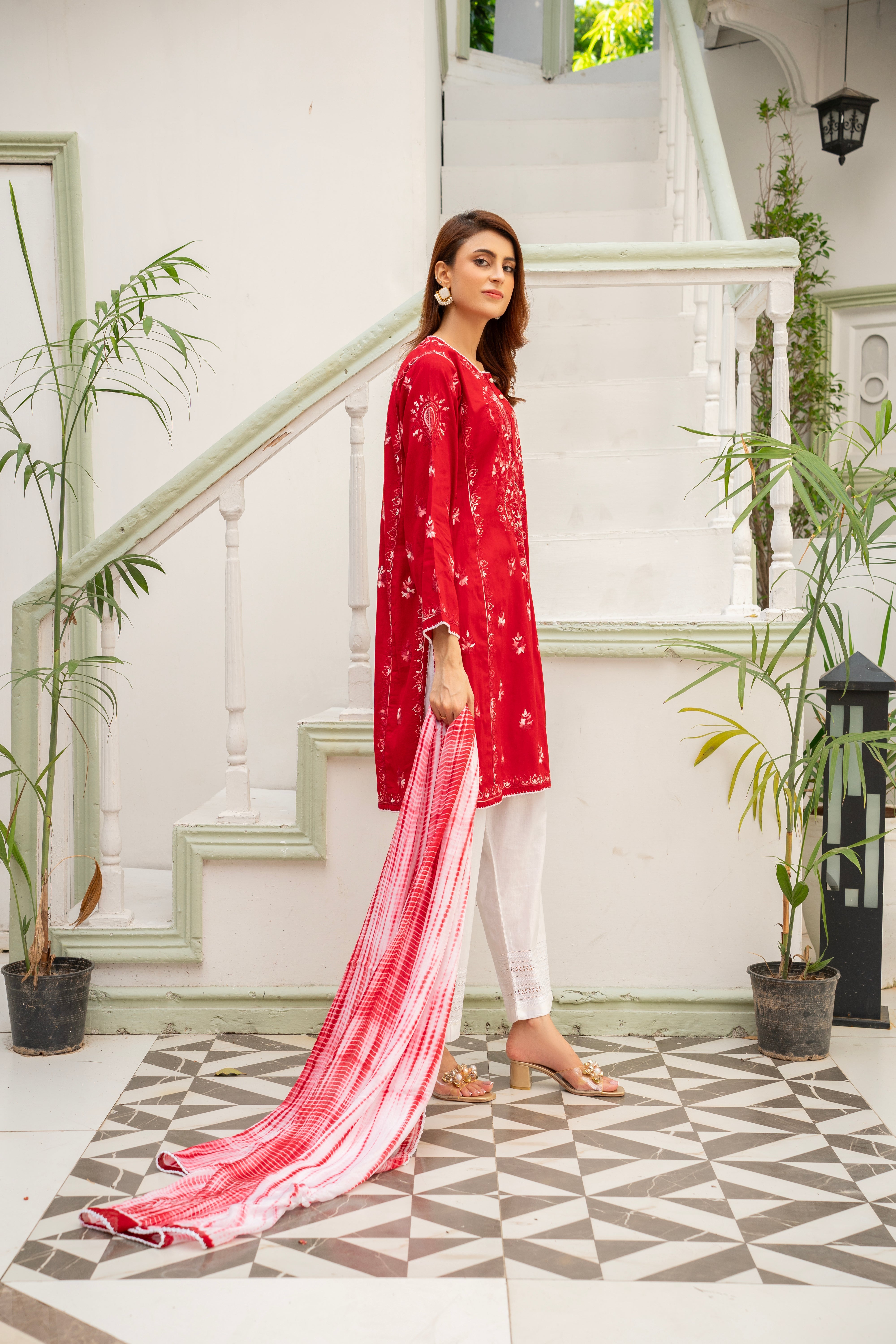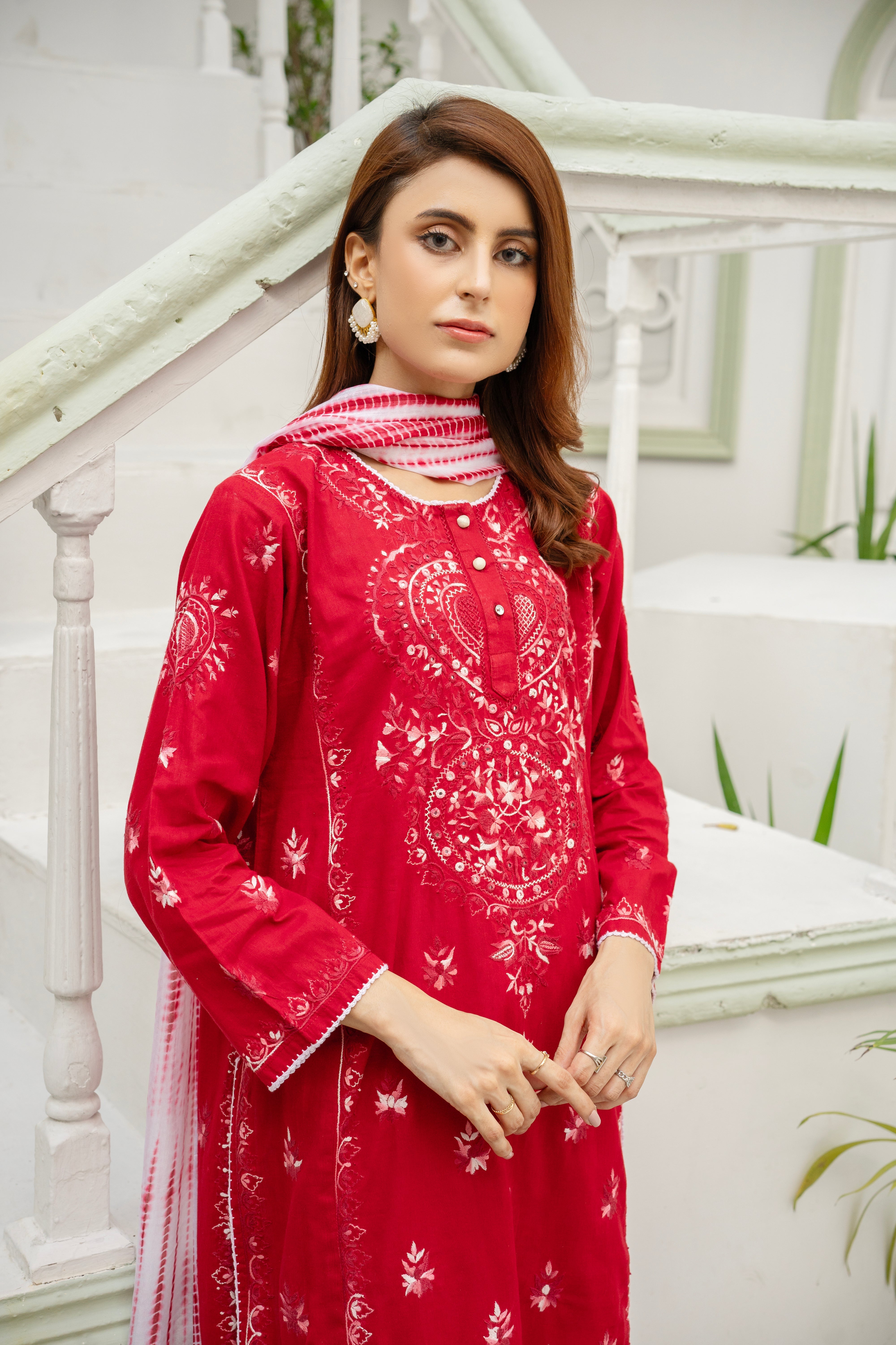 Maroon Embroidered Kurti With Dupatta – ( Stitched )