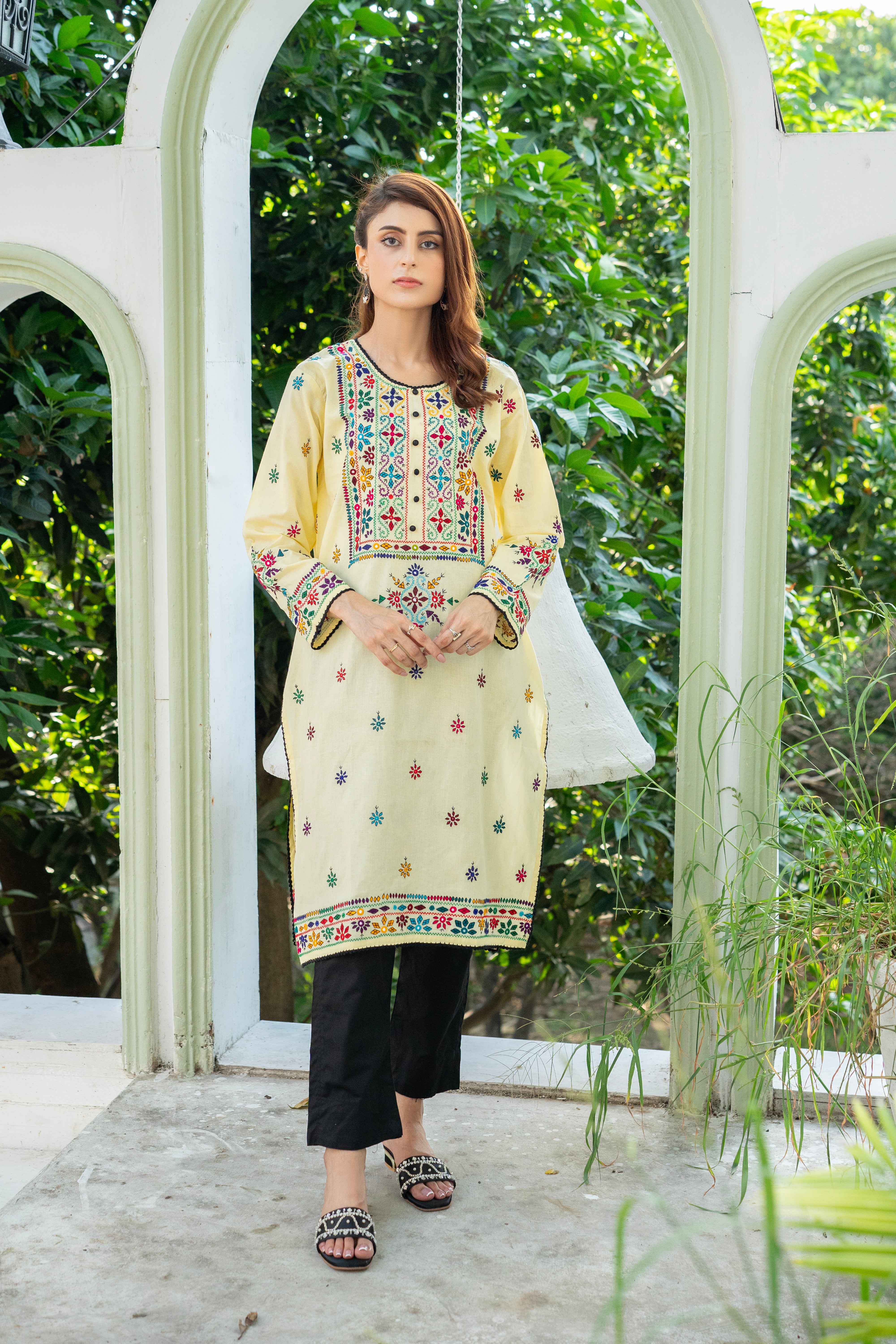 Traditional Lime Yellow Embroidered Kurti - ( Sttiched )