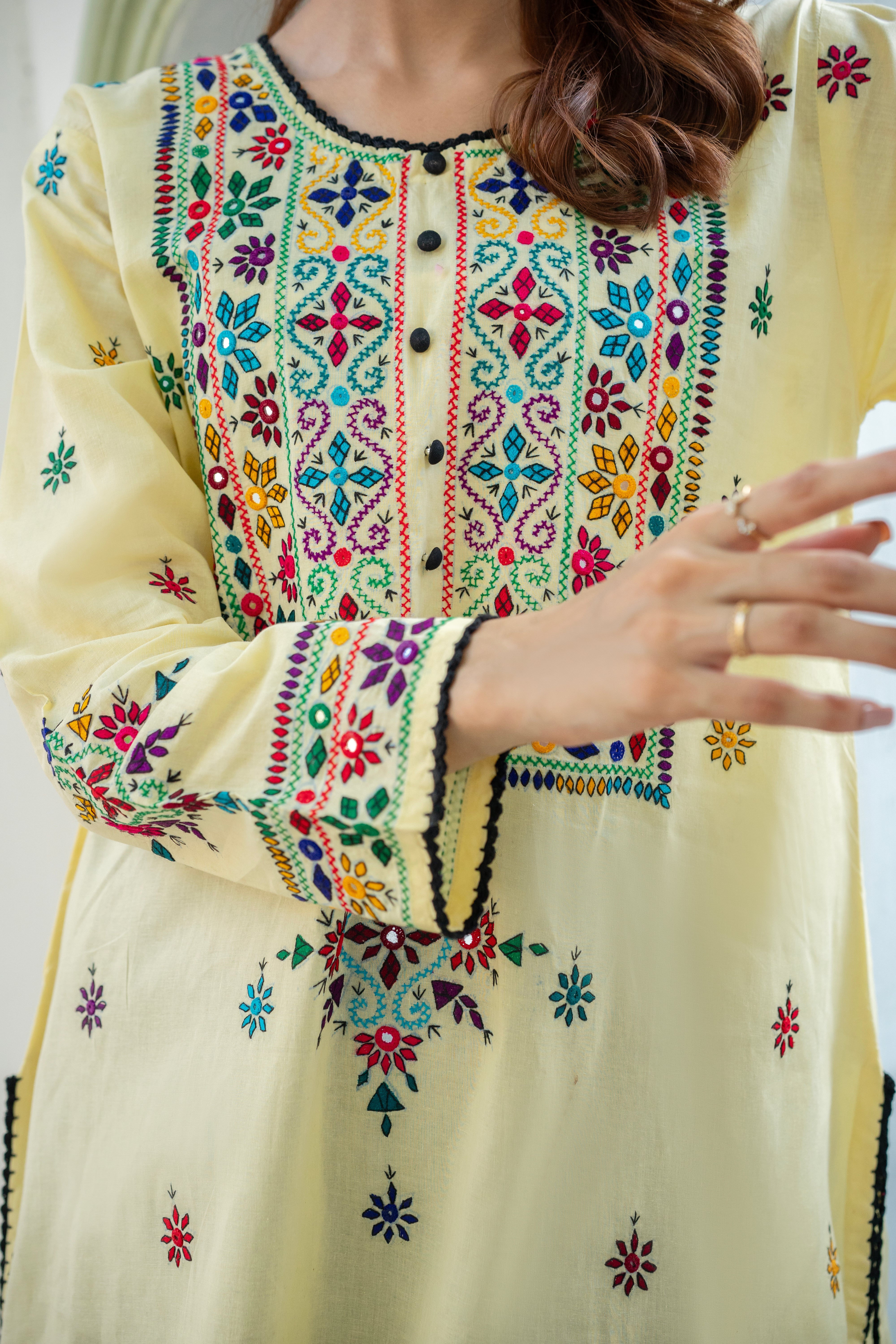 Key Features: Color:  Lime Yellow Technique : Hand Embroider , Mirror work finished with crochet  Fabric: Loan/Cotton...