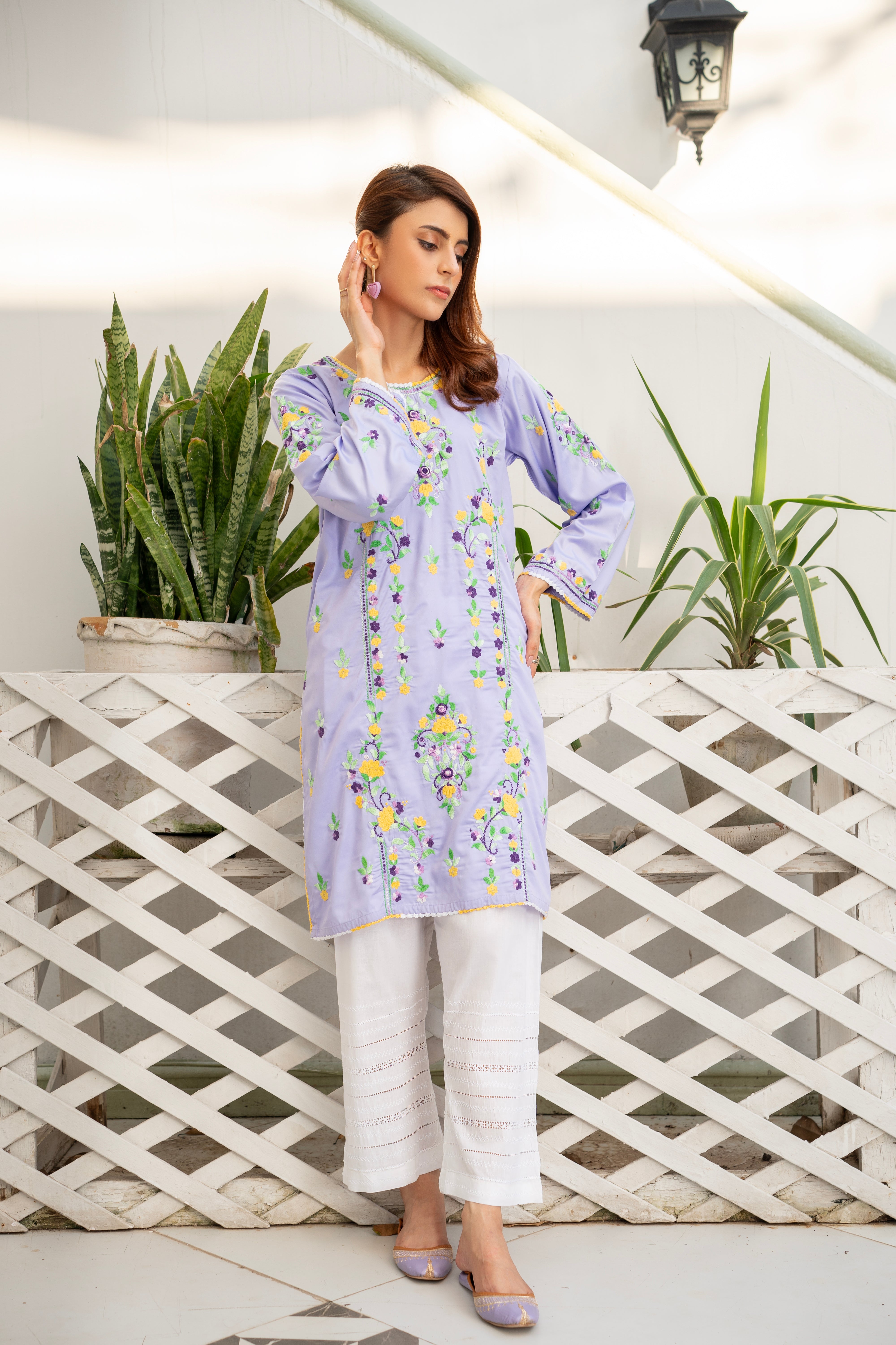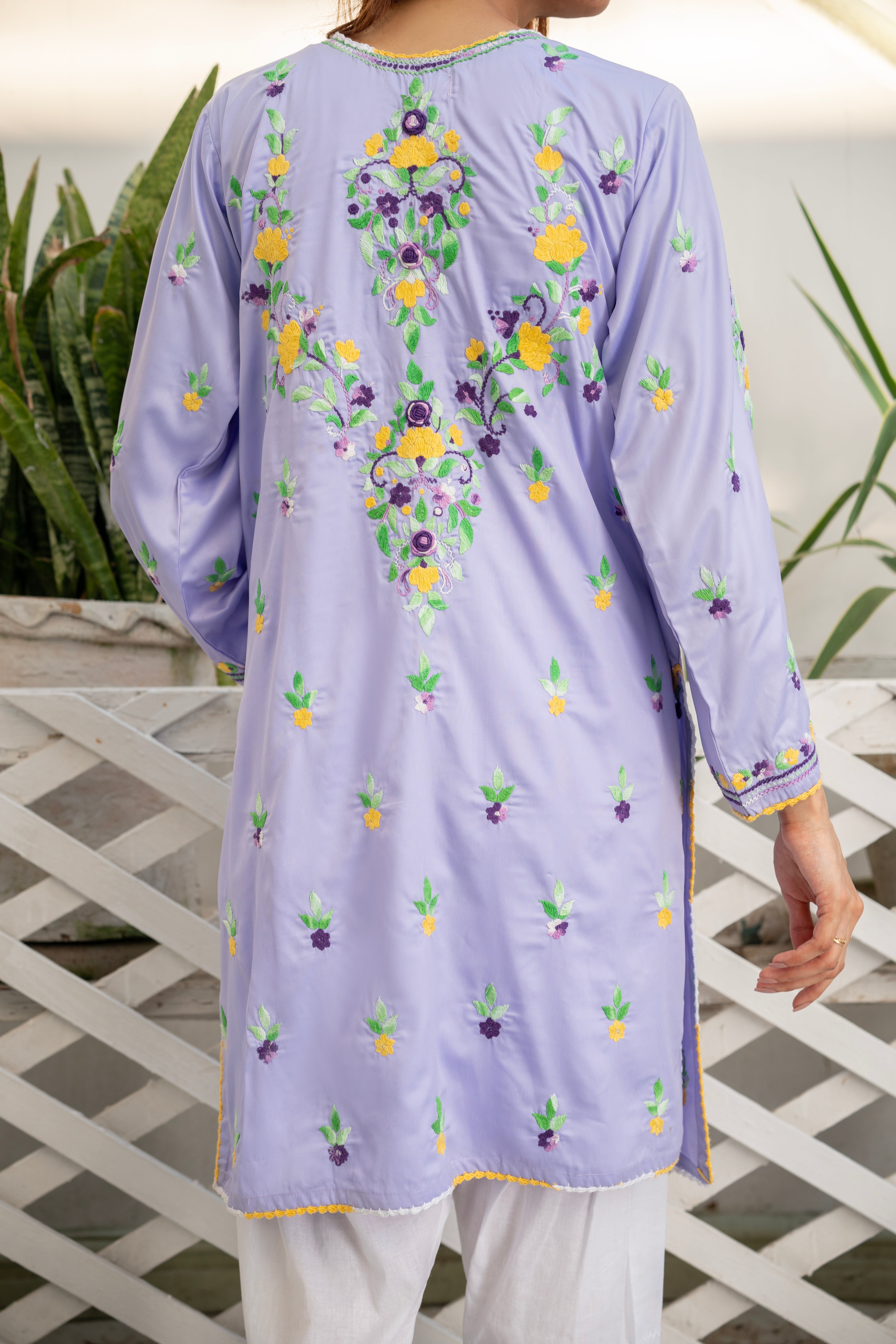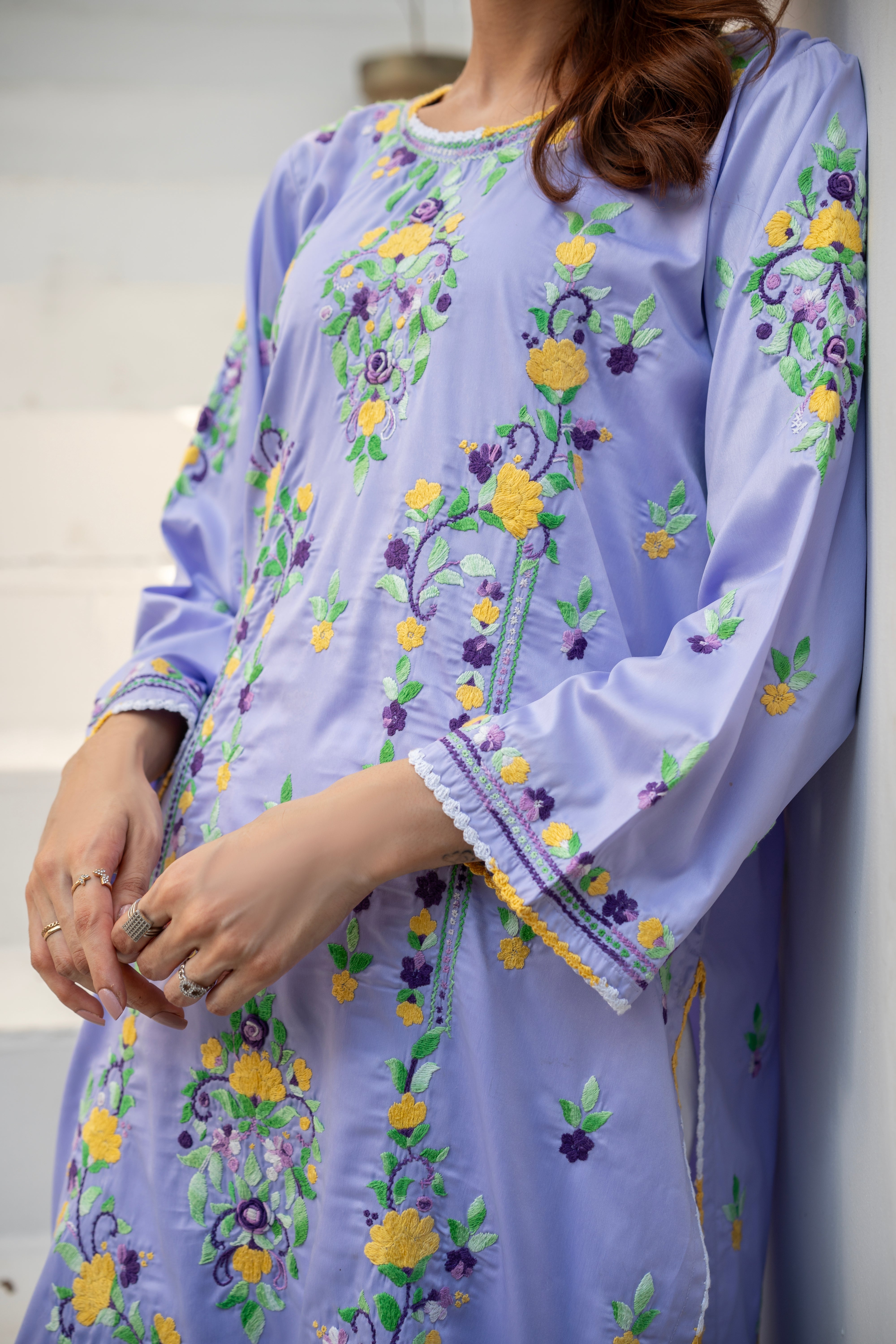 Timeless elegance with our Hand-Embroidered Lavender Mist shirt. This exquisite piece is crafted from premium fabric in a soothing lavender color, perfect for adding a subtle pop of color to any wardrobe. The intricate, hand-embroidered floral designs across the neckline, back side and cuffs highlight the artisanal craftsmanship, adding a delicate and refined touch to this graceful silk kurta by finishing it with crochet.
